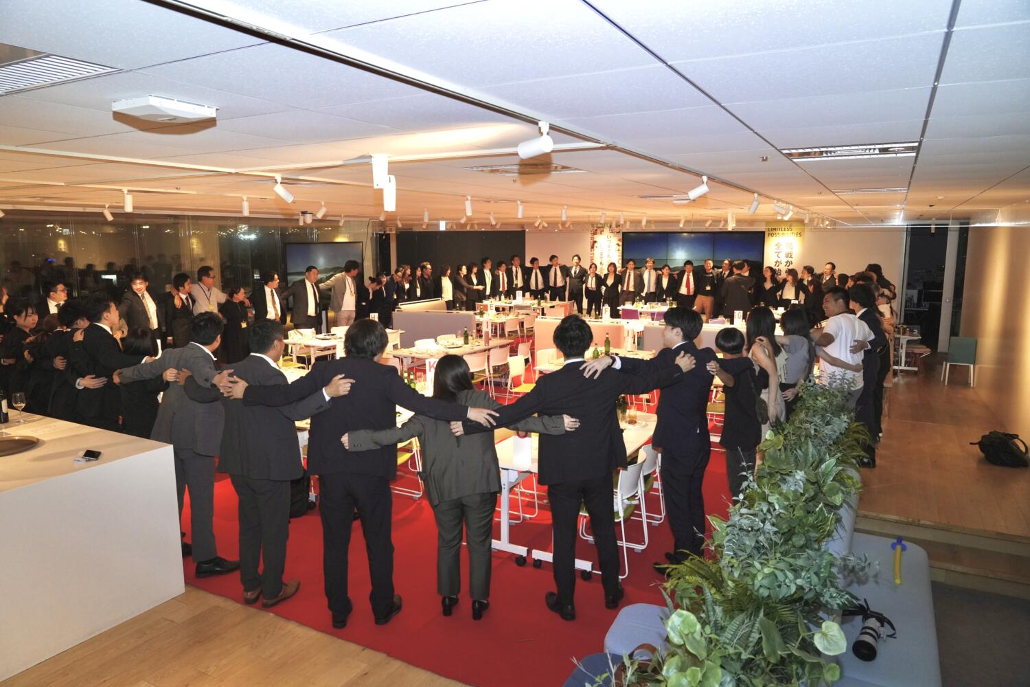 あつまるでは半年に1回、全従業員とそのご家族、パートナー企業の皆様を招待して行う「決起集会」というイベントがあります。そのイベントの最後には、みんなで一つの大きな輪を作ってゆずの「栄光の架け橋」を歌います。