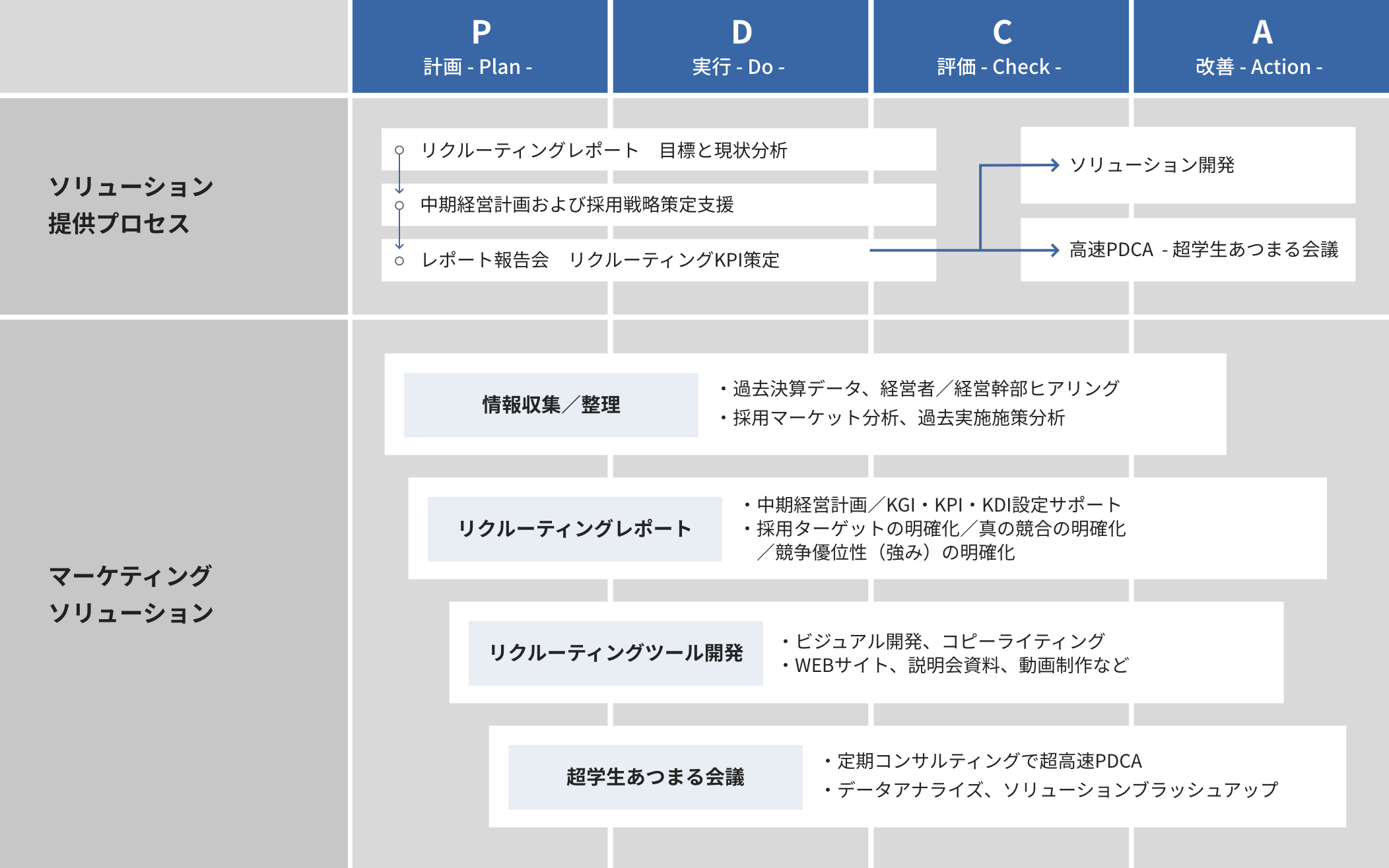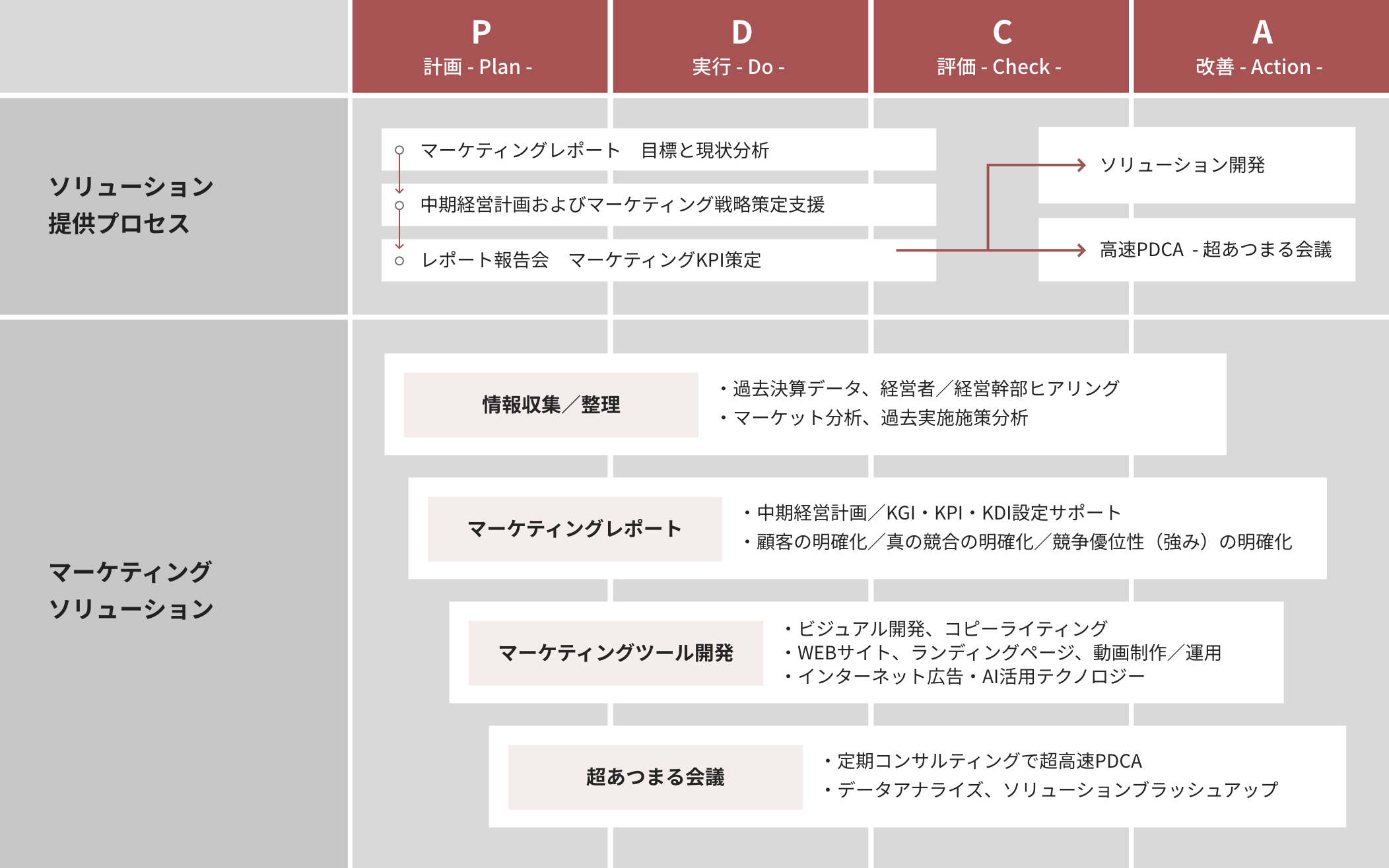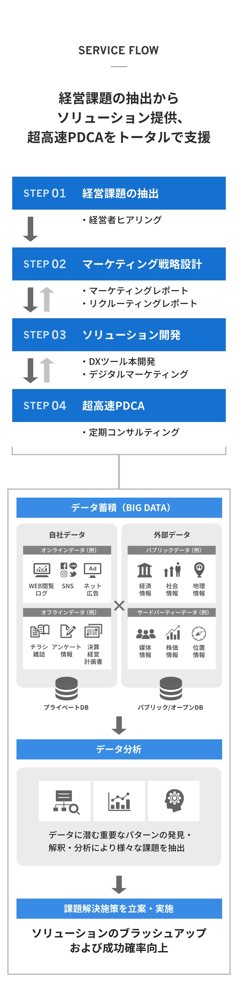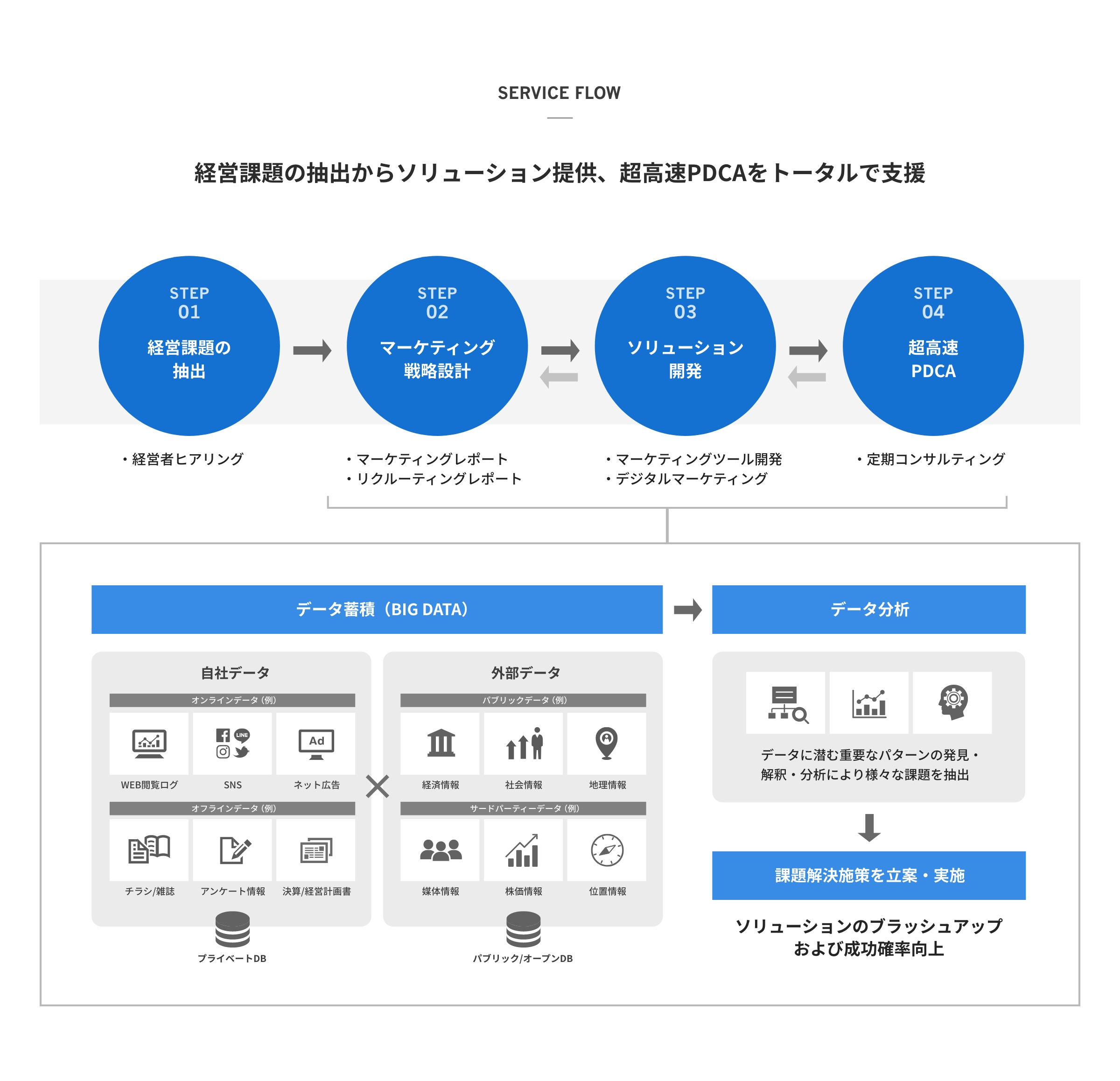 これまで人の感覚や勘に頼って行われていた「あいまいな集客」を分析し、顧客の集客効果を数値化。導き出したデータをもとにマーケティング戦略の策定からツールの開発、さらには超高速PDCAにいたる全てのプロセスで支援します。広告宣伝費及び販売促進費の費用対効果を向上させ、目先の売上・売上総利益の向上を追い求めるばかりではなく、顧客の中長期的な営業利益の向上に貢献します。